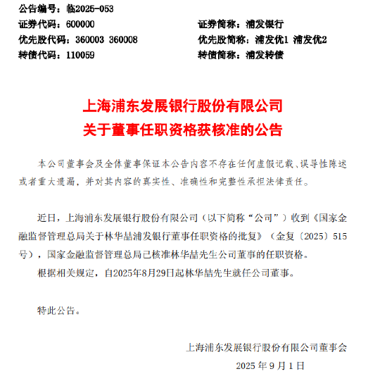 9月1日金融一线消息,浦发银行今日发布公告称, 近日收到《国家金 融监督管理总局关于林华喆浦发银行董事任职资格的批复》,国家金融监督管理总局已核准林华喆公司董事的任职资格。 根据相关规定,自2025年8月29日起林华喆就任公司董事。